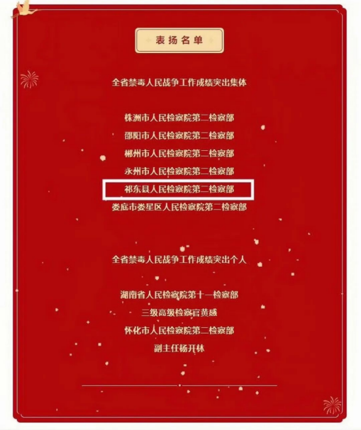 1月13日,新一轮湖南禁毒人民战争部署大会在长沙召开。省禁毒委员会对禁毒工作成绩突出集体和个人,予以通报表扬,祁东县人民检察院第二检察部荣获集体表彰。
